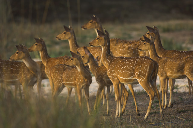As the warming November sun sinks slowly to the horizon, casting ever-lengthening shadows on the forest floor, the mood in the jungle changes. Spotted deer (chital) that were relaxed and grazing contently in the open only minutes earlier, take on a more rigid, alert appearance, their senses heightened with the increased vulnerability that comes with nightfall. Overhead a troop of langurs settles down for the night, huddling together for warmth as the sun relinquishes its hold on the land, surrendering to the chill of night. From their lofty position they have an excellent view of the forest and are a welcome friend for the chital, warning of any impending danger. But for now, they are quiet and all is well.