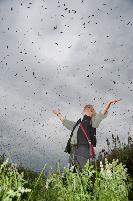 Our mornings began at 4am when it was still dark. After a cup of tea we headed off to a different hide - this time the BBC hide. An apparently precarious affair, the BBC hide is in two parts, the first a steep wooden ladder against a large tree leading to a platform that was approximately 3 metres by 3 metres. The second stage from here is a steel ladder (without a protective handrail) leading up to a smaller steel platform. Whether you are on the first level or the second, you essentially have your head in the bats as they return from their nighttime feeding to a temporary roost, and then depart en-mass to their daytime roost right over the top of the platform.