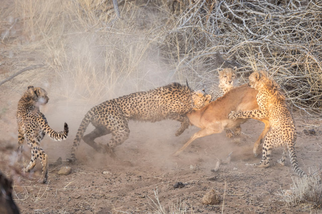 On our second morning drive, we found a cheetah, at sunrise, sitting by the road with her three subadult cubs. As we arrived, they were just stretching and making their way to the waterhole nearby. After drinking, the cubs were playing but mum became focused on something and began to move away. As she started to trot, the cubs followed close behind. As we turned the corner, she was sitting still and the cubs were hiding by a tree trunk, watching a herd of impala that was grazing nearby and had become aware of her presence. The impala started to retreat but she was off, chasing them through a gulley and over the top, with a cloud of dust showing that a scuffle was taking place. We raced over the hill, along with her cubs, and there she was with her jaws around the neck of a large male impala. He made three valiant attempts to escape, but in the end, succumbed to his fate and provided the cheetahs with a much-needed meal. It's always hard to watch, but nature is nature and it’s a real privilege to watch a hunt in action.