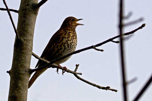 The closely related song thrush sounds entirely different. It repeats a short, shrill phrase several times before moving on to repeat another shrill phrase a few times. Often there are quieter chattering noises between phrases, though it is the shrill parts which give a song thrush away.