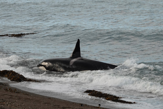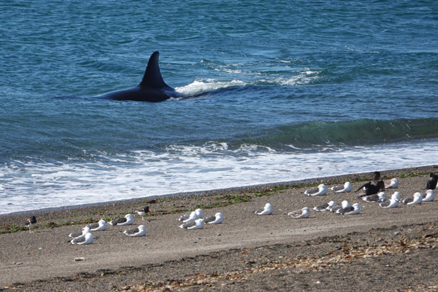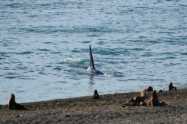 Skirting the submerged reef, he was moving towards us, his huge dorsal fin a clear marker in the breaking azure waves. “Keep coming, keep coming. Please just keep coming!” I silently willed him on and my word, he listened. Cruising along the shoreline now that the tide had risen, he was so close, ridiculously close in fact, to the beach where South American sea-lions and a small group of Southern elephant seals lay basking in the sunshine. From our angle, he looked less than a metre away from them. We grinned discretely at each other, acknowledging both our good fortune at his presence and at just how special this moment was.