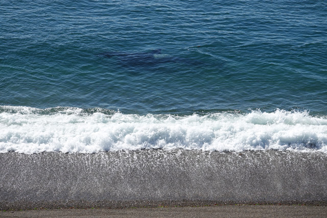 Once he was level with our elevated cliff top position we urgently gathered up cameras, tripods and binoculars, our excitement levels palpable as we trotted (ahem, ran) along the boardwalk in our desperation to keep up with the perfect fluidity of his effortless motion below. Suddenly he turned towards the beach. Attention caught (his and ours!) and perpendicular now, he stopped, and our adrenaline spiked as we waited with bated breath for what he may do next. “Strand! Strand! Strand!” Again, I willed him on to surf the high tide, rising like a phoenix from the depths in order to snatch his unsuspecting prey. Intentional stranding is the official term for this highly specialised hunting technique utilised by a minority of orca, and we were here very much hoping to see it.