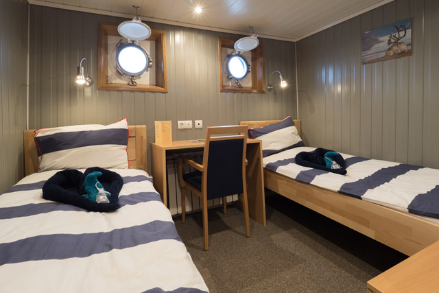 Retreat to one of the eight cosy cabins, each boasting private facilities and stunning views of the Arctic landscape. Choose from double cabins with portholes on the lower deck, spacious twin cabins with windows on the main deck, or luxurious superior cabins with double beds and expansive windows on the upper deck.