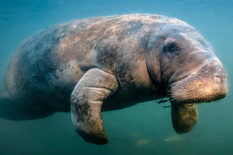 Though their size can be imposing, manatees are naturally curious and remarkably gentle creatures. In the warm spring waters, they often approach swimmers with slow, deliberate movements, sometimes brushing past, following quietly, or nudging gently out of interest.