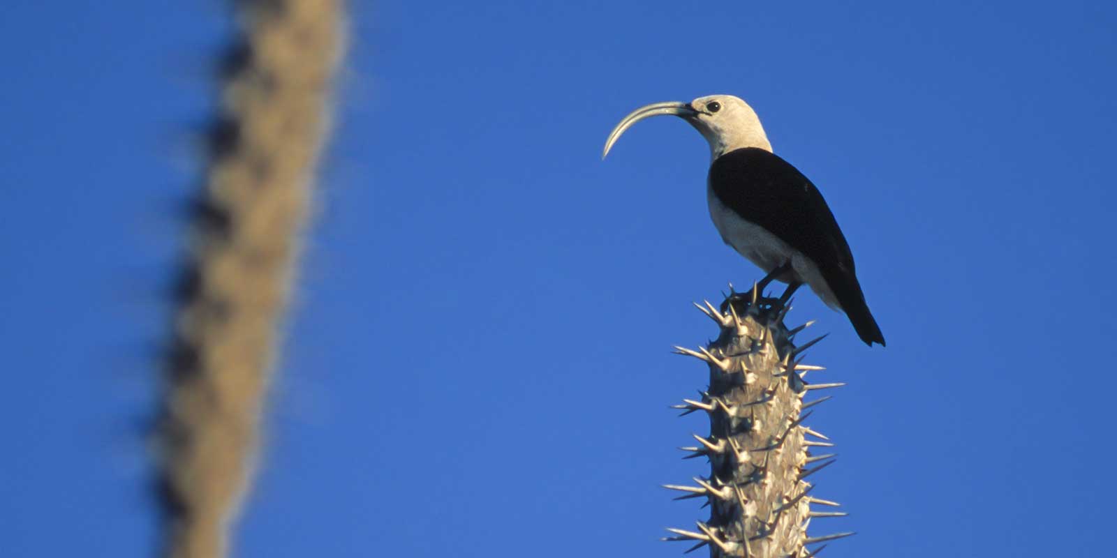 Although unprotected, the spiny forests inland from Ifaty are of great interest to birdwatchers and botanical enthusiasts alike. Two of the island’s most threatened birds, the long-tailed ground roller and sub-desert mesite, are often see here, on early morning bird walks. There is plenty more of interest, not least an excellent diversity of other birds and some of the most bizarre flora imaginable – fascinating spiny forest of Alluadia madagascariensis in which the crazy waving branches of devilishly-spined octopus trees contrast sharply with the squat, rounded forms of bulbous baobabs.
