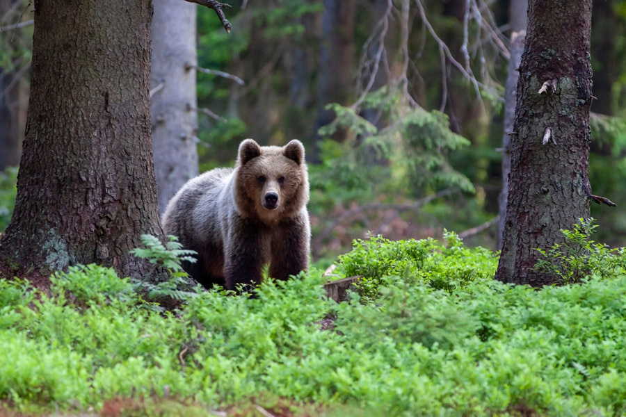 Martinselkonen Nature Reserve is one of the most reliable locations in Finland for observing Eurasian brown bears in their natural habitat. Situated in the remote wilderness and taiga forest of Eastern Finland, close to the Russian border in the municipality of Suomussalmi (150 kilometres from Kuusamo, 170 from Kajaani, 180 from Kuhmo and 270 from Oulu), this tranquil reserve is filled with spruce, pine, and birch trees, creating a dense canopy which provides the resident wildlife with shelter from the elements. The bear watching here is fantastic with there having been sightings of over 15 bears in one night, and although they are undoubtably the star attraction here, the reserve is home to so much more remarkable wildlife, including the occasional Eurasian wolf, wolverine and elk, red squirrels and various bird species, such as white-tailed eagle, black kite, great grey owl, Ural owl, bullfinch, great spotted woodpecker and Siberian jay.