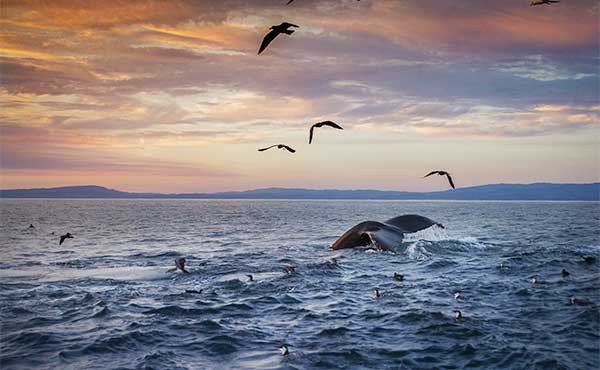 An amazing variety of cetaceans can be regularly observed out in Monterey Bay including grey, humpback and blue whales, Pacific white-sided, Risso's and common dolphins, orca, and Dall's porpoise. Other marine mammals that can be encountered are sea otter, northern fur seal and California sealion. Monterey Bay is also home to a remarkable diversity of birdlife with some of the notable highlights being sooty shearwater, long-tailed skua, marbled murrelet, pigeon guillemot, brown pelican, rhinoceros auklet and black storm-petrel.