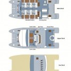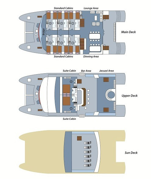 A power catamaran yacht, the Anahi offers eight lower berth cabins, comprising of six double/twins and two suites, all with en suite bathrooms, large portrait windows, air-conditioning, and amenities. Social areas include a relaxing lounge and bar area, hot tub, solar deck with lounge chairs, entertainment room with television and DVD player, table games and an outside dining area. WiFi is also available.
