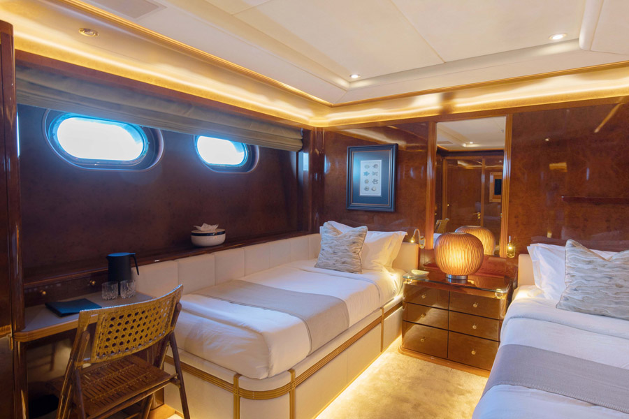 Guests are accommodated in seven sea-facing design suites, located across three decks. The onboard living and social areas comprise a sun deck with panoramic dining, outdoor barbecue area, hot tub, indoor lounge and dining room, and library. The vessel is also fully equipped for adventure, with onboard double kayaks, paddleboards and snorkelling gear.