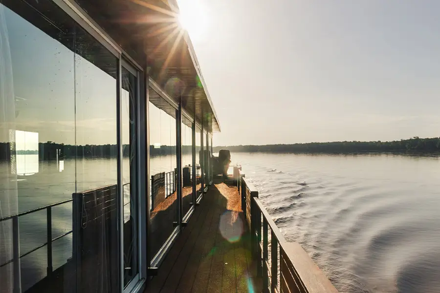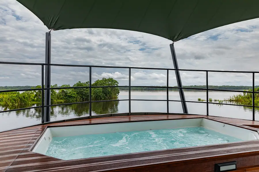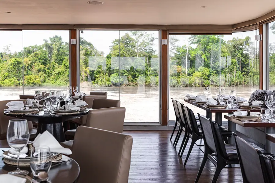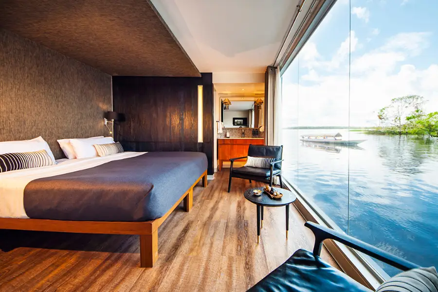 Boasting just 16 spacious suites, each featuring floor-to-ceiling windows, the Aria Amazon provides an intimate and exclusive setting for exploring Peru's pristine waterways. Its stylish and contemporary design complements the surrounding jungle, creating a connection with nature even from the comfort of the ship.