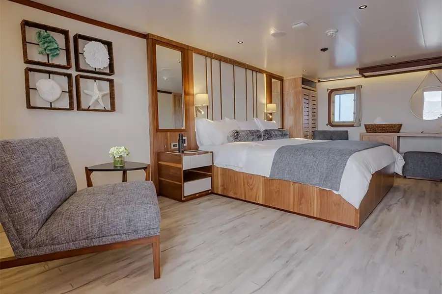 Accommodating up to 32 guests, Evolution offers 16 well-equipped cabins, including three master suites, four deluxe staterooms, and nine premium staterooms. Each cabin is tastefully furnished with luxury wood finishes and features en suite bathrooms, air-conditioning, and ample storage space. Master suites boast ocean-view windows, while the other staterooms feature large traditional portholes.