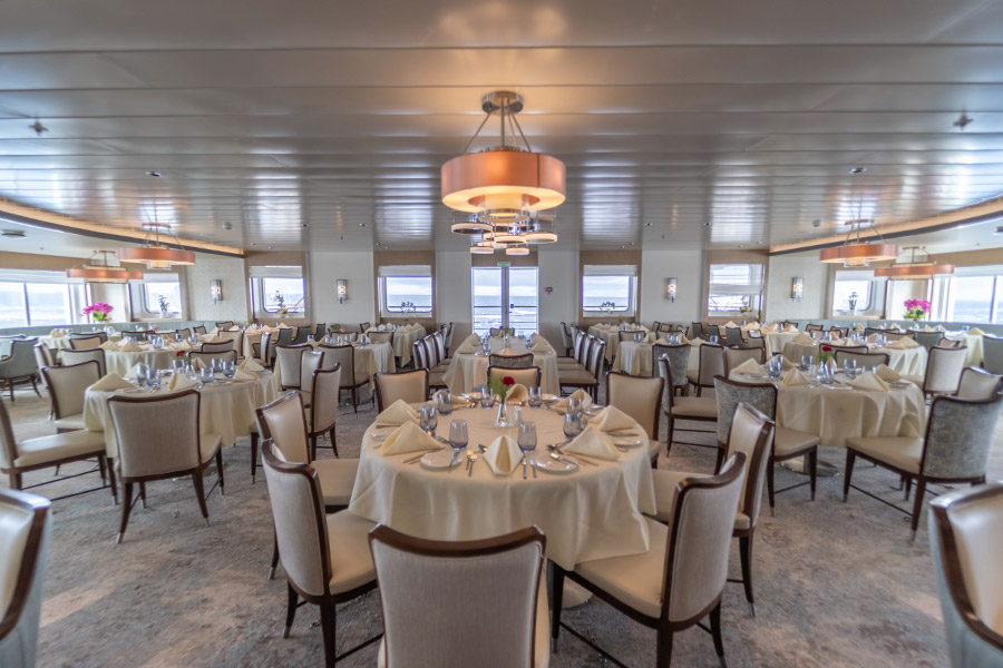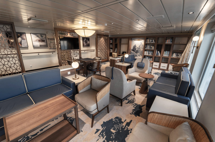 Facilities on-board the Greg Mortimer include the lecture theatre, two hot tubs, library, gym, and wellness centre. Meals are taken in the dining room with an open seating policy to mingle with fellow passengers, and the fully-stocked bar allows access to the magnificent views on offer in the observation lounge.