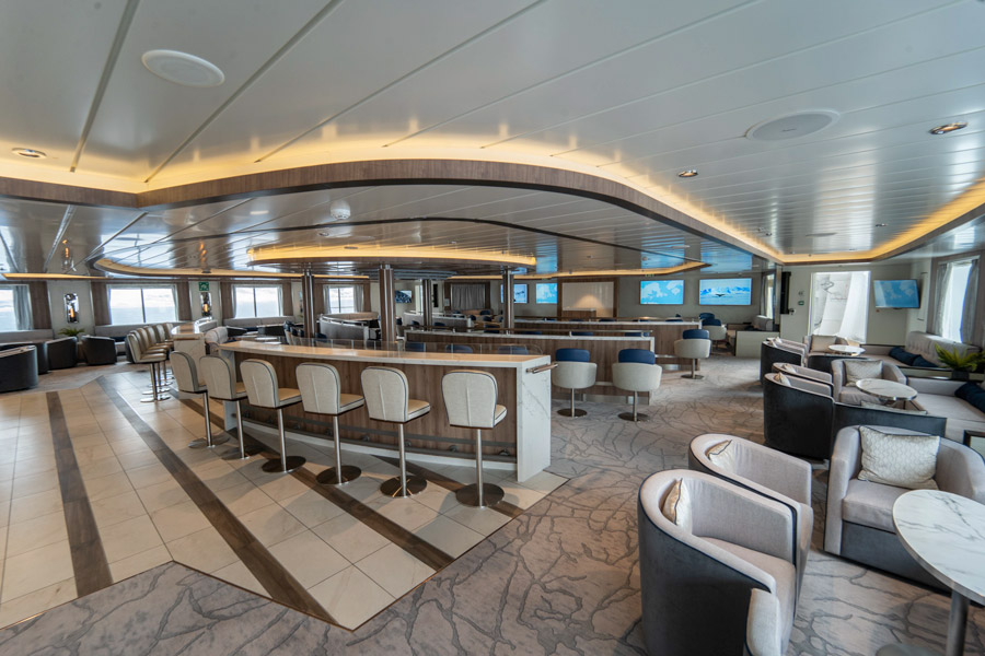 The Greg Mortimer’s state-of-the-art bow and hull, the X-BOW®, allows for a more comfortable voyage at sea along with being environmentally friendly with lower fuel consumption and air emissions. Dedicated observations areas include a 360-degree unobstructed view with a combination of outdoor platforms and observation lounge, and when cruising at slow speed, specially designed hydraulic platforms can be accessed from the lecture theatre to provide you with a unique way to observe passing sea birds and wildlife.