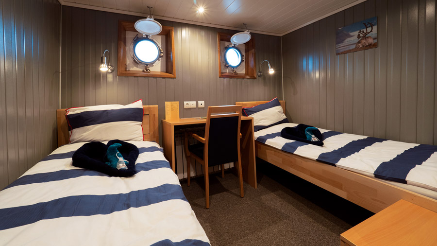 Eight cabins have private facilities and only a maximum of 12 passengers on board. Each cabin has a porthole or window spread across the lower, main and upper decks. The dining area can also be found on the main deck, where all meals are served throughout any voyage. There is also a very comfortable lounge, the perfect space to sit back and relax, listening to talks and presentations from the experts on board. There is, of course, one more important thing to note, and that is that there is an open bridge policy aboard the ship.