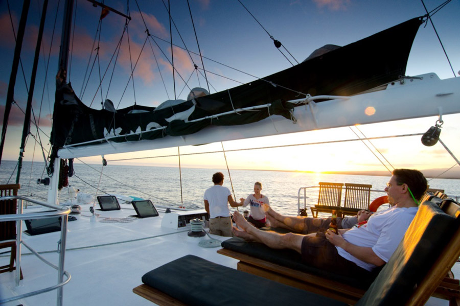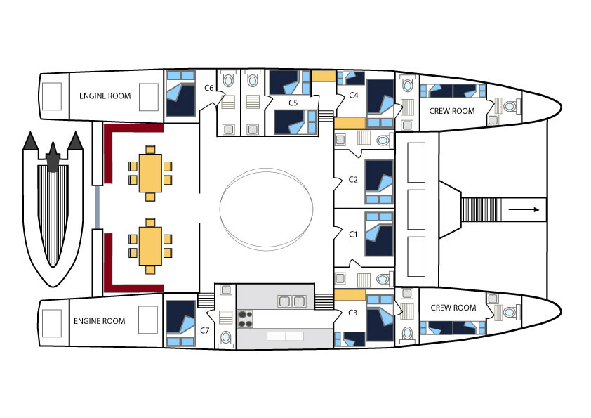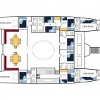 This first class sail catamaran offers well-appointed cabins, each slightly different in size and configuration, carefully designed to fit into this unique vessel.