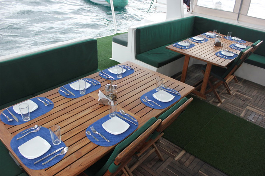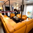 On board facilities include a sun deck complete with lounge chairs, outside dining area, bar and indoor common area.