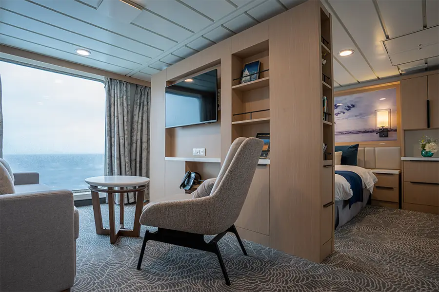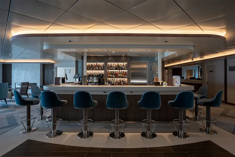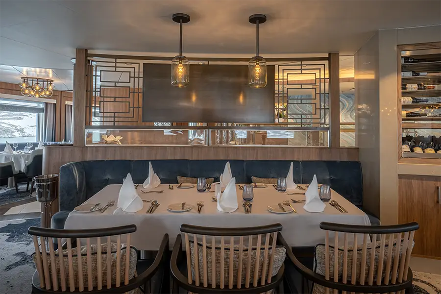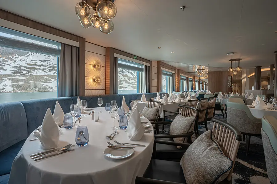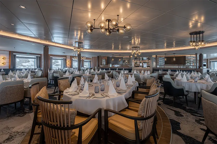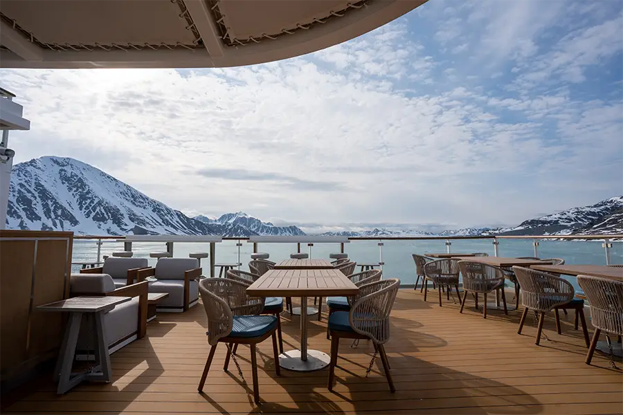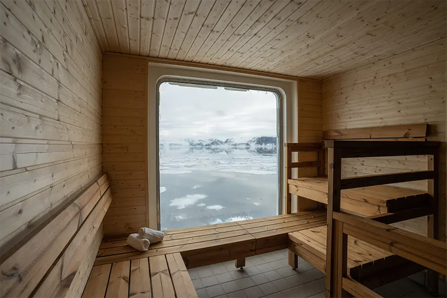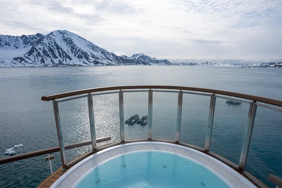 Onboard, guests will find a range of amenities designed for both relaxation and exploration. Two outdoor hot tubs offer panoramic views of the surrounding landscapes, while a wellness centre and spa provide a tranquil retreat after a day of adventure. A sauna and gym are also available.