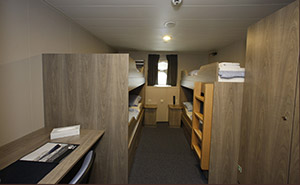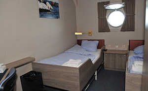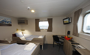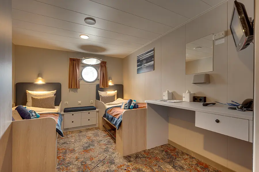 Cabins range from triple to superior, all with outside view and private facilities. The large open deck spaces offer excellent opportunities to watch wildlife, and the two starboard-side gangways guarantee smooth Zodiac operations.