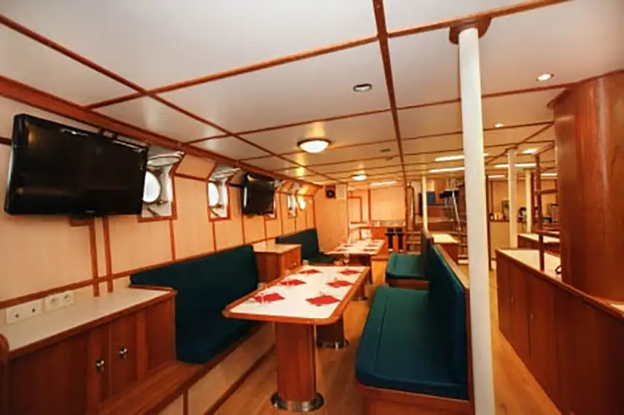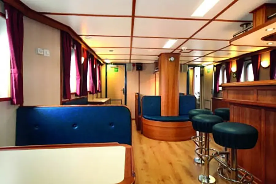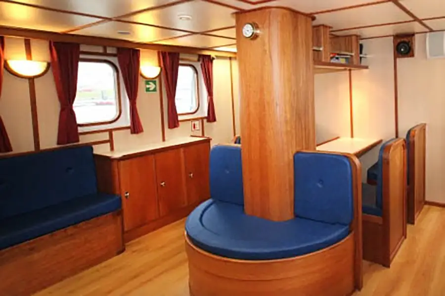 The ship cruises at an average speed of 6.5 knots and accommodates up to 33 passengers in 16 cabins. The cabin options include one triple cabin with a porthole, six twin inside cabins, and nine twin cabins with portholes.
