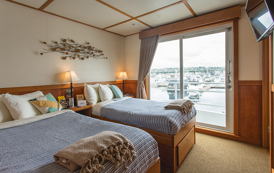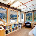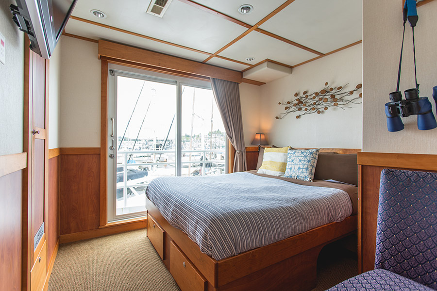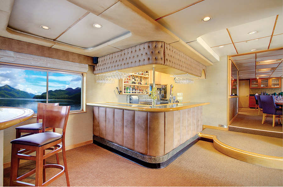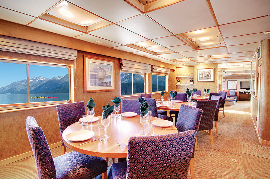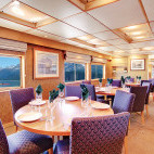 The observation deck provides panoramic views and features an on-deck hot tub and fitness centre. The bridge deck houses the exclusive admiral cabins, a small library and offers open access to the bridge for those curious about navigation. The main deck is the heart of social activity, featuring the dining room, bar, and lounge where guests can indulge in delicious cuisine and refreshing beverages. Onboard amenities include kayaks, paddleboards, and inflatable skiffs for easy exploration.