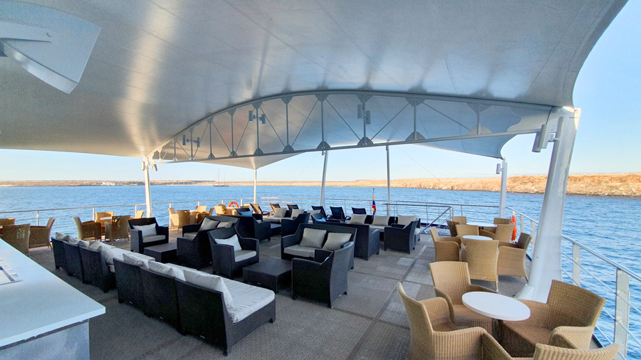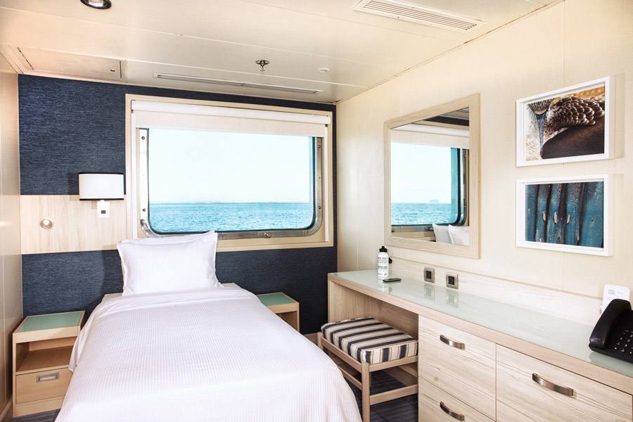 This large, first-class vessel carries a maximum of 90 passengers in 50 modern cabins for exploring the Galapagos archipelago.