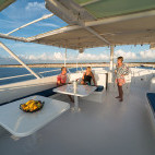 Equipped with two tenders, she offers a large air-conditioned saloon where breakfast and dinner are served, as well as an entertainment centre and the galley. There is a sundeck and a flybridge with an awning that offers plenty of seating, a BBQ and a wet bar. There are also outdoor showers and space to hang up wetsuits between excursions. Wetsuits and snorkelling equipment may be hired onboard, and credit cards are accepted. There is no WiFi or cell phone reception in Silver Bank, so consider this a chance to digitally detox and immerse yourself in all things whales.